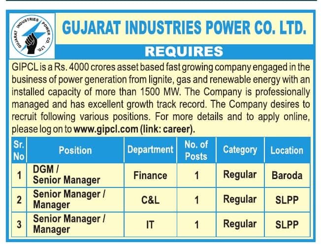 GIPCL Recruitment 2025: ગુજરાત રાજ્યની ઊર્જા અને પાવર સેક્ટરની અગ્રણી સંસ્થાઓ દ્વારા વર્ષ 2025 માટે અનુભવી અને લાયક ઉમેદવારો માટે વિવિધ ઉચ્ચ કક્ષાના પદો પર ભરતી જાહેર કરવામાં આવી છે. આ ભરતી પાવર જનરેશન, ગેસ ટ્રાન્સમિશન, ફાઇનાન્સ, IT, હ્યુમન રિસોર્સ, પ્રોજેક્ટ્સ તેમજ હેલ્થ સેફ્ટી એન્ડ એન્વાયરમેન્ટ જેવા મહત્વપૂર્ણ વિભાગોમાં કરવામાં આવશે. રાજ્ય અને રાષ્ટ્રીય સ્તરે કાર્યરત આ સંસ્થાઓમાં કારકિર્દી બનાવવા ઇચ્છુક ઉમેદવારો માટે આ એક ઉત્તમ તક છે.