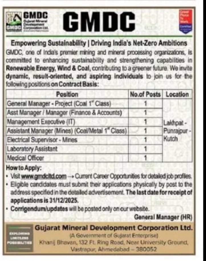 GMDC Recruitment 2025: ગુજરાત મિનરલ ડેવલપમેન્ટ કોર્પોરેશન લિ. દ્વારા વિવિધ પદો પર સ્ત્રીઓ તથા પુરુષો માટે ભરતી જાહેર