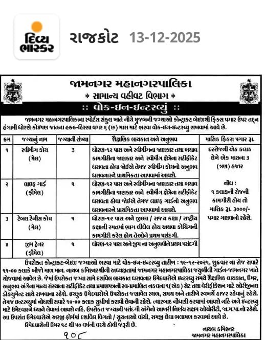 Jamnagar Municipal Corporation Recruitment: જામનગર મહાનગરપાલિકા દ્વારા રમતગમત ક્ષેત્રે રસ ધરાવતા અને જરૂરી લાયકાત ધરાવતા ઉમેદવારો માટે એક આકર્ષક તક જાહેર કરવામાં આવી છે. મહાનગરપાલિકા સંચાલિત સ્પોર્ટ્સ સંકુલમાં વિવિધ જવાબદારીઓ માટે ઉમેદવારોની પસંદગી કરવા વોક-ઇન-ઇન્ટરવ્યુનું આયોજન કરવામાં આવ્યું છે. આ ભરતી દ્વારા શહેરના રમતગમત માળખાને વધુ સક્રિય અને સુવ્યવસ્થિત બનાવવા પ્રયાસ કરવામાં આવી રહ્યો છે. રમતગમત ક્ષેત્રે અનુભવ ધરાવતા તેમજ નવી શરૂઆત કરવા ઇચ્છુક યુવાઓ માટે આ ઉત્તમ અવસર ગણાય છે. પસંદગી પ્રક્રિયા સરળ અને પારદર્શક રાખવામાં આવી હોવાથી વધુમાં વધુ લાયક ઉમેદવારો સરળતાથી ભાગ લઈ શકે તેવો ઉદ્દેશ રાખવામાં આવ્યો છે.