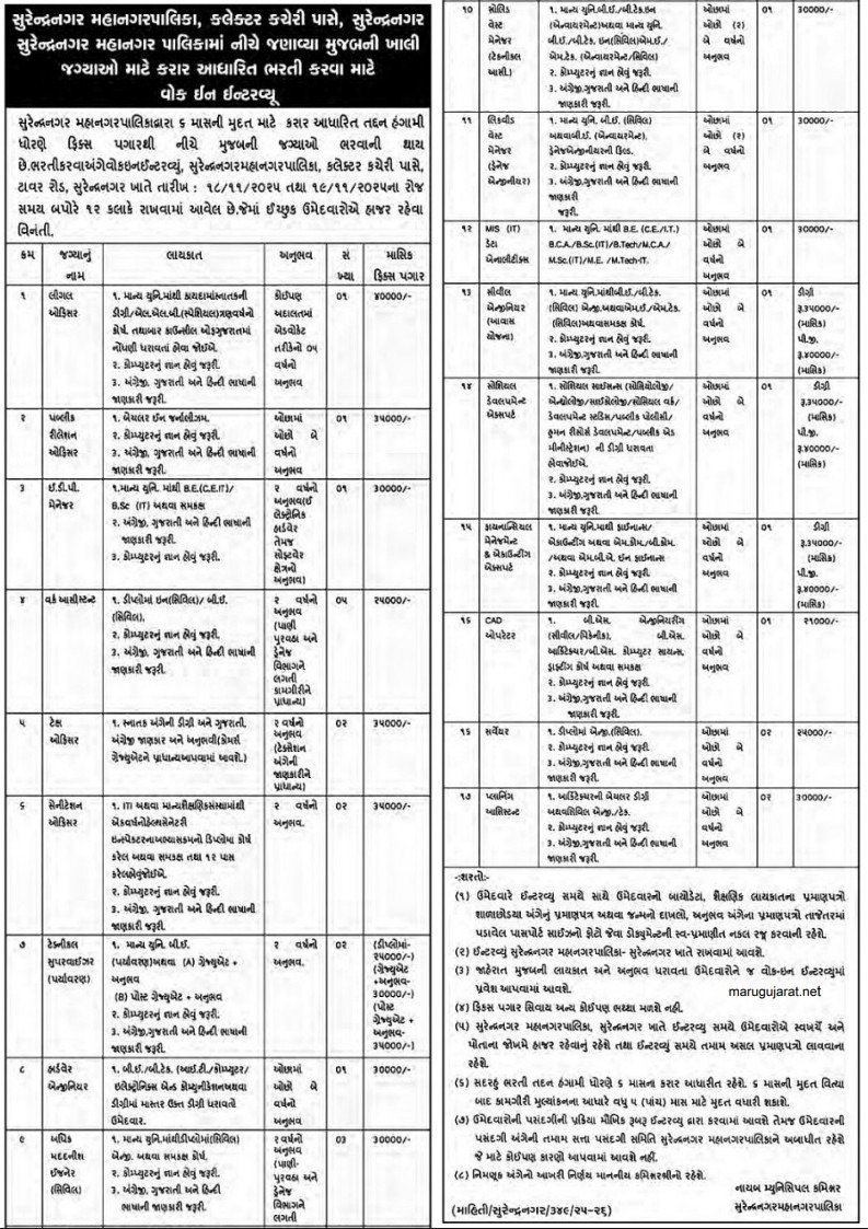 નોંધ: આ માહિતી સુરેન્દ્રનગર મ્યુનિસિપલ કોર્પોરેશન ની સત્તાવાર જાહેરાતના આધારે આપવામાં આવી છે. અરજી કરતા પહેલા સત્તાવાર વેબસાઇટ પર વિગતો ચોક્કસ ચકાસી લો.